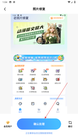 4、選好照片后,點擊頁面底部的確認(rèn)處理按鈕,等待應(yīng)用對照片進(jìn)行智能修復(fù)處理。