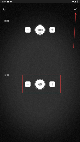 3、找到音調(diào)并在下方進(jìn)行調(diào)整,調(diào)整好后再點(diǎn)擊右上角打鉤的按鈕。