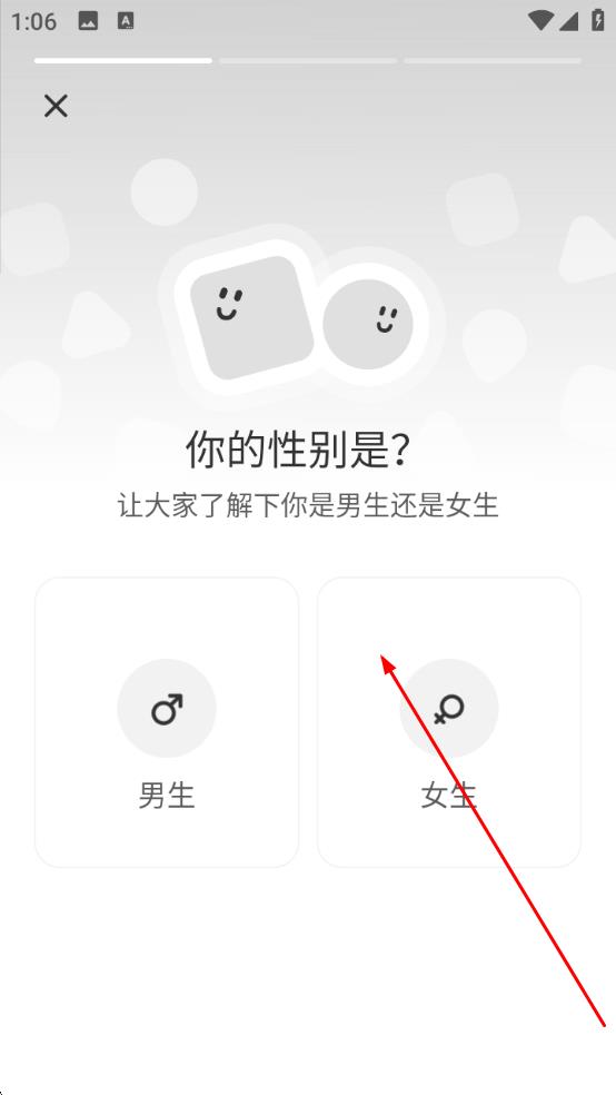 1、選擇性別:在性別選擇頁,點(diǎn)擊男生或女生,選定自身性別。