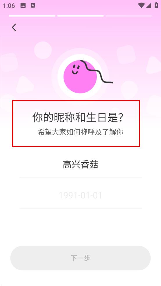 2、填寫信息:進(jìn)入昵稱和生日填寫頁,輸入昵稱,補(bǔ)充生日日期,填好后點(diǎn)下一步。