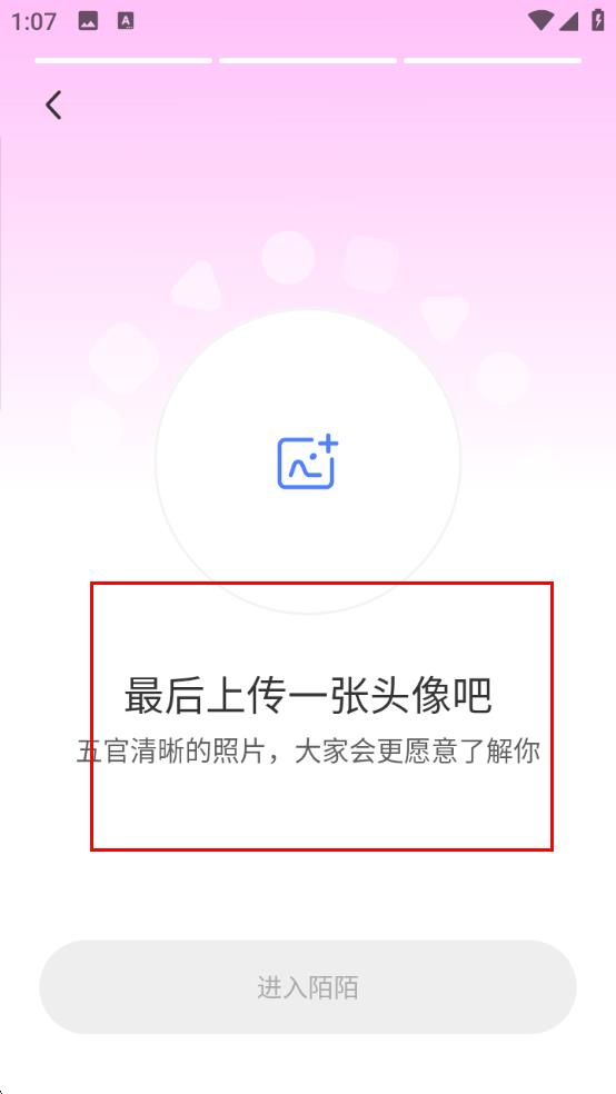 3、上傳頭像:在頭像上傳頁,點(diǎn)擊頭像上傳區(qū)域,選擇一張五官清晰照片作為頭像,完成后點(diǎn)進(jìn)入陌陌,即可完成注冊信息完善。