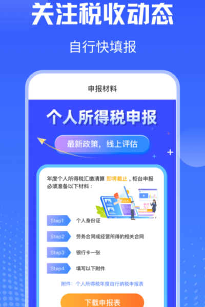 個(gè)人所得稅申報(bào)app是一款個(gè)稅申報(bào)應(yīng)用,可以讓您更方便的計(jì)算出應(yīng)繳納稅費(fèi),可申請(qǐng)退稅,內(nèi)置便捷稅收計(jì)算器,個(gè)人所得稅、工薪稅,年終稅等等稅收,準(zhǔn)確計(jì)算,還能根據(jù)您的所在地智能調(diào)整相關(guān)比例,省時(shí)省心,功能多樣,能力強(qiáng)大,使用便捷,快速下載,精準(zhǔn)報(bào)稅,想知道每個(gè)月繳納了多少個(gè)人所得稅,新規(guī)個(gè)稅政策下,不知道需要補(bǔ)稅還是退稅?一鍵在線評(píng)估幫你輕松解決個(gè)稅問(wèn)題,有需要的用戶可免費(fèi)下載使用。