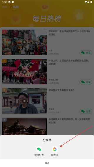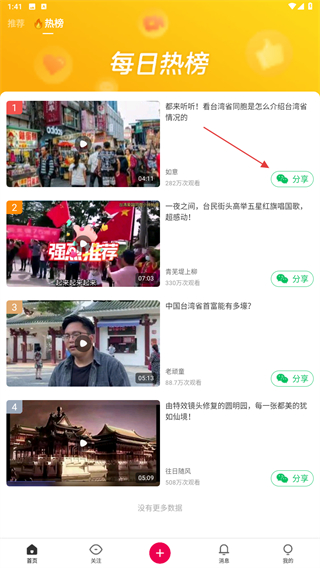 2、進(jìn)入每日熱榜的頁面內(nèi),選擇并點(diǎn)擊視頻右側(cè)分享的按鈕。