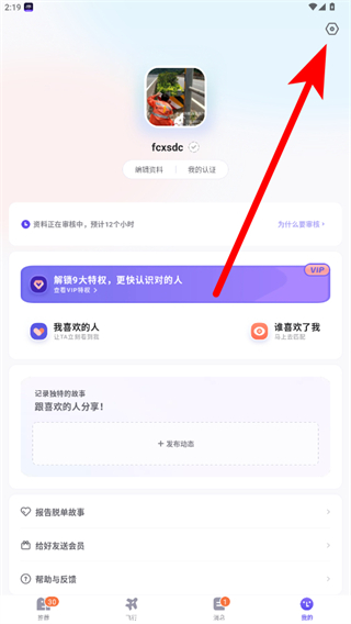 1、打開她說,在個人頁面,點擊右上角的設置圖標。