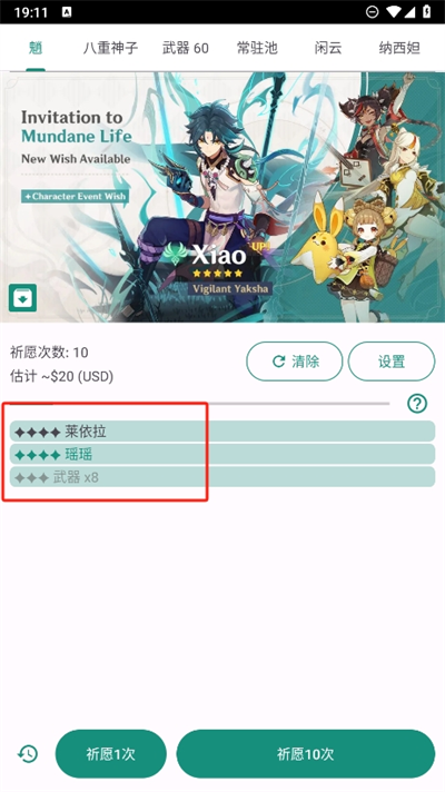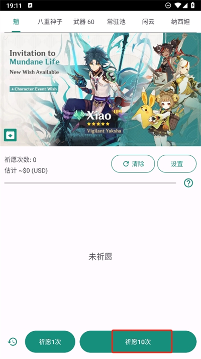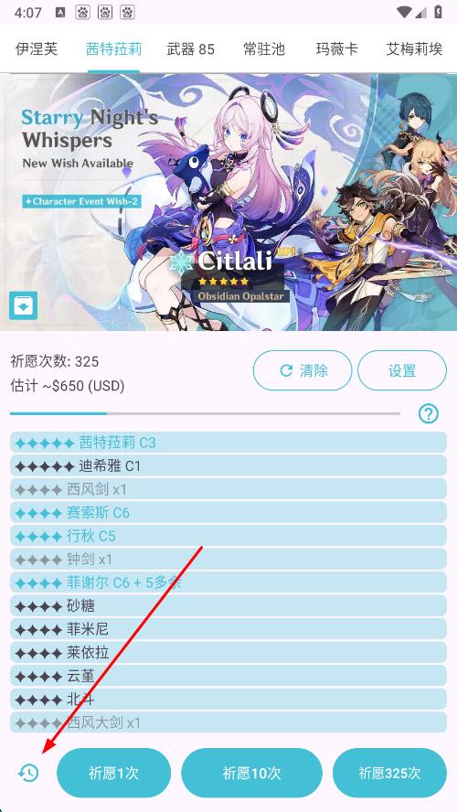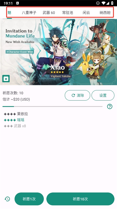 4、在這里還能切換不同的角色進行模擬祈愿,而且每一次的祈愿都會進行全部的數(shù)據(jù)記錄。