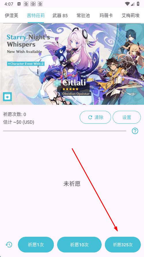 1、在原神抽卡模擬器界面,點擊下方祈愿325次按鈕進行抽卡,獲取抽卡結(jié)果。