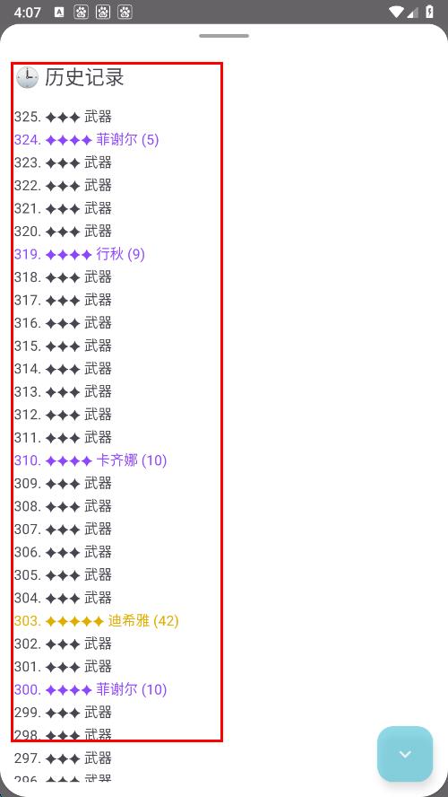 3、點擊后會彈出顯示框,按順序記錄著每次抽卡結(jié)果,包含抽到的角色或武器等信息。