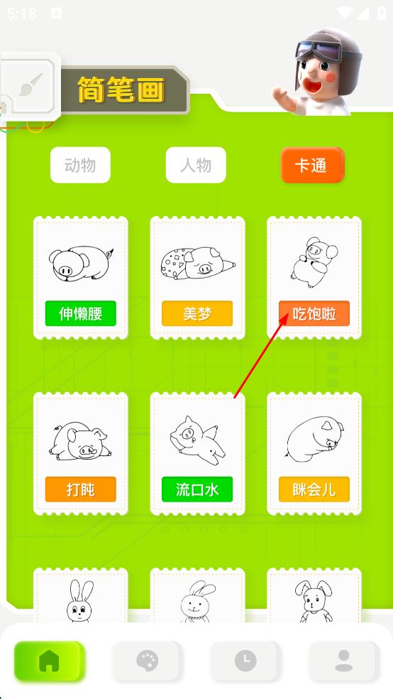 3、進入所選分類頁面后,挑選想要繪制的簡筆畫圖案,比如“吃飽啦”圖案,點擊該圖案,進入簡筆畫繪制頁面。