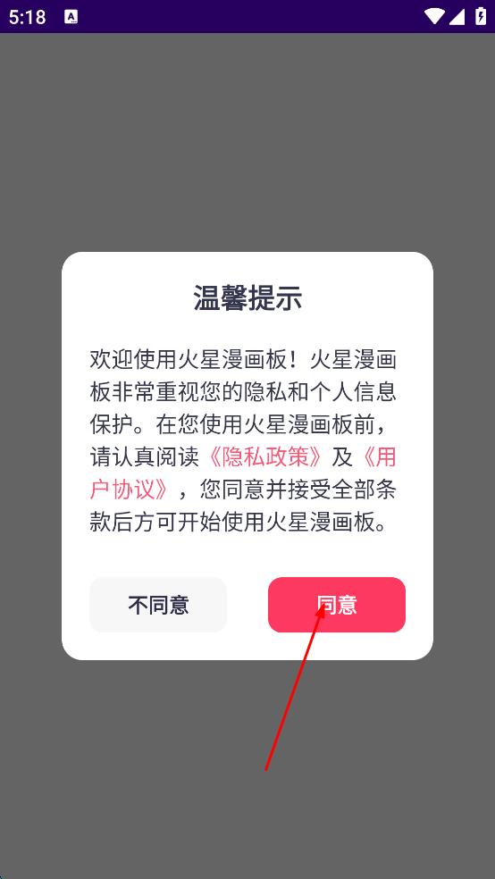 1、打開火星漫畫板APP,在溫馨提示界面,認真閱讀隱私政策及用戶協(xié)議后,點擊同意,進入APP主界面。