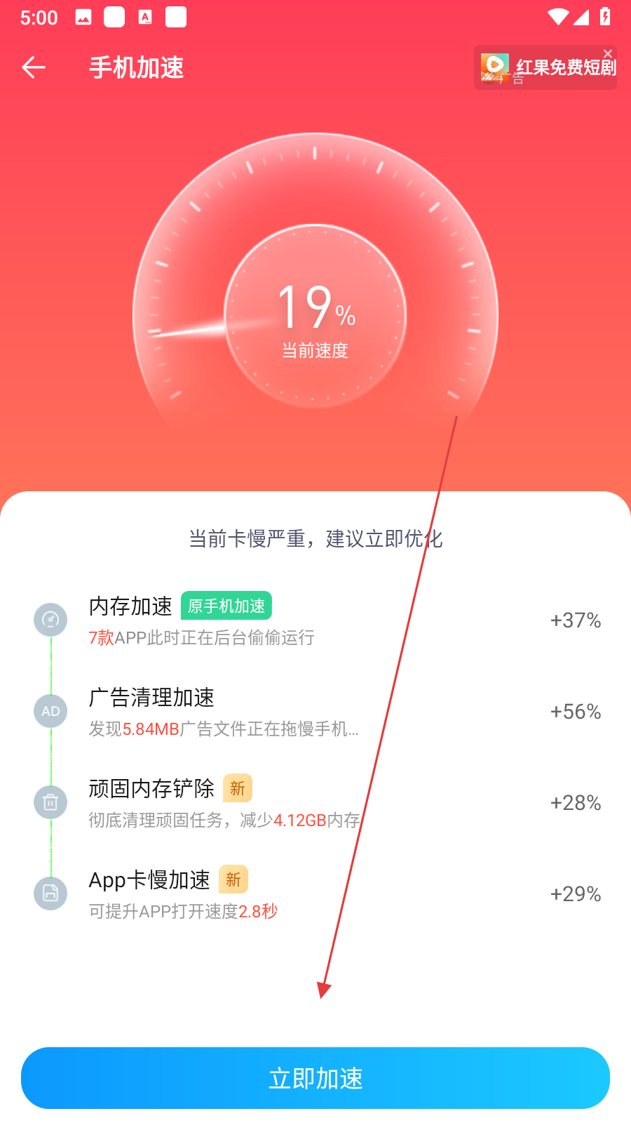 2、掃描結(jié)束之后,點(diǎn)擊下方的立即加速,即可清理垃圾,清除后臺(tái)給手機(jī)加速。