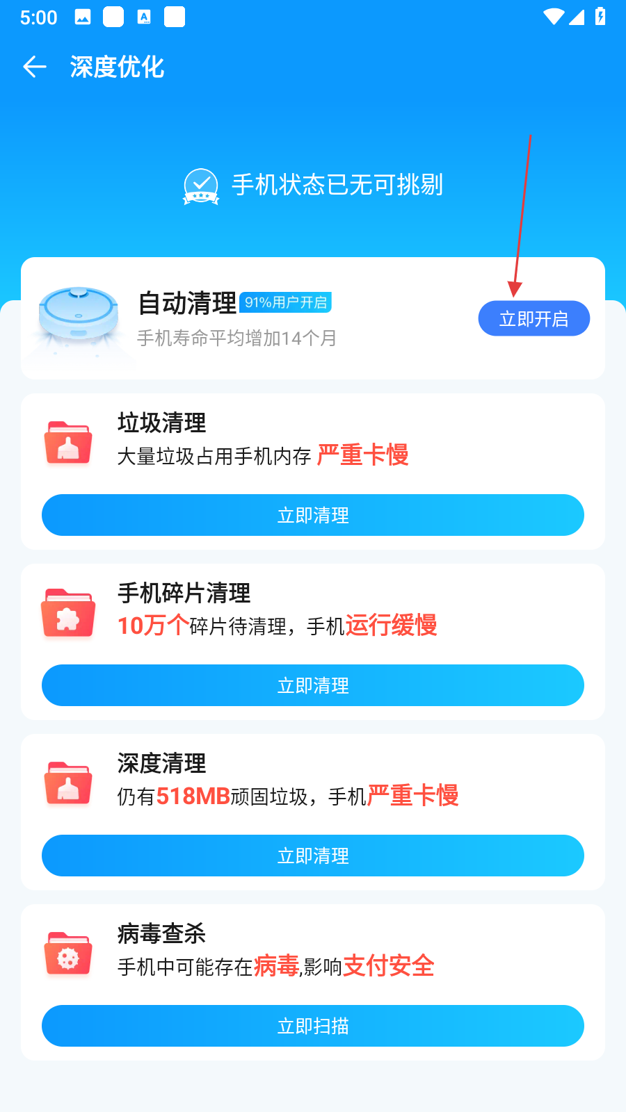 3、加速完之后,可以點(diǎn)擊開啟自動(dòng)清理,開啟之后就會(huì)自動(dòng)清理垃圾,讓手機(jī)不再卡頓。