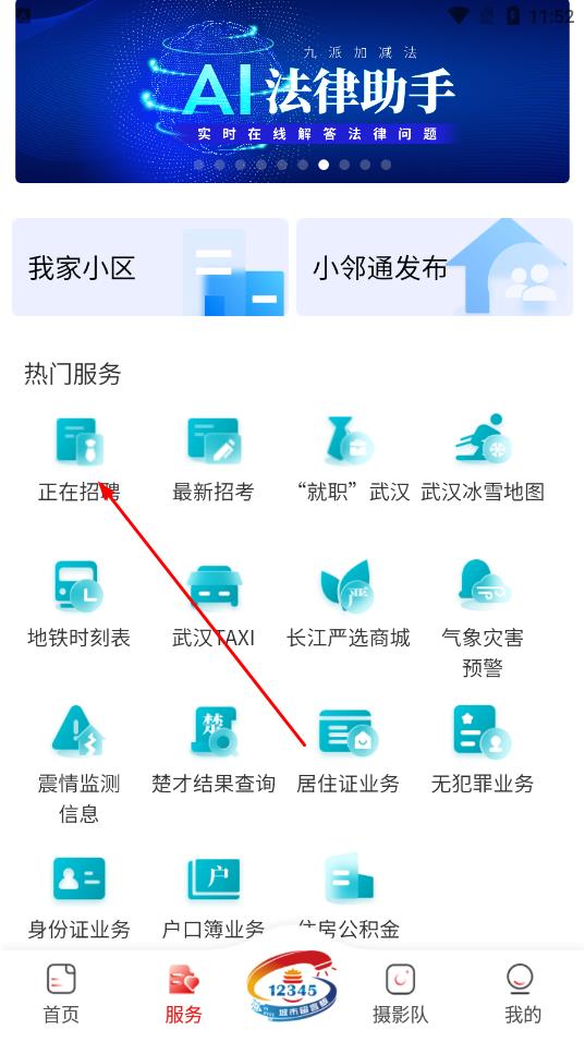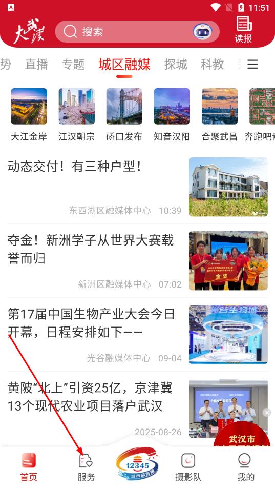 1、打開“大武漢”App,進(jìn)入首頁,點(diǎn)擊底部導(dǎo)航欄中的服務(wù)選項(xiàng)。