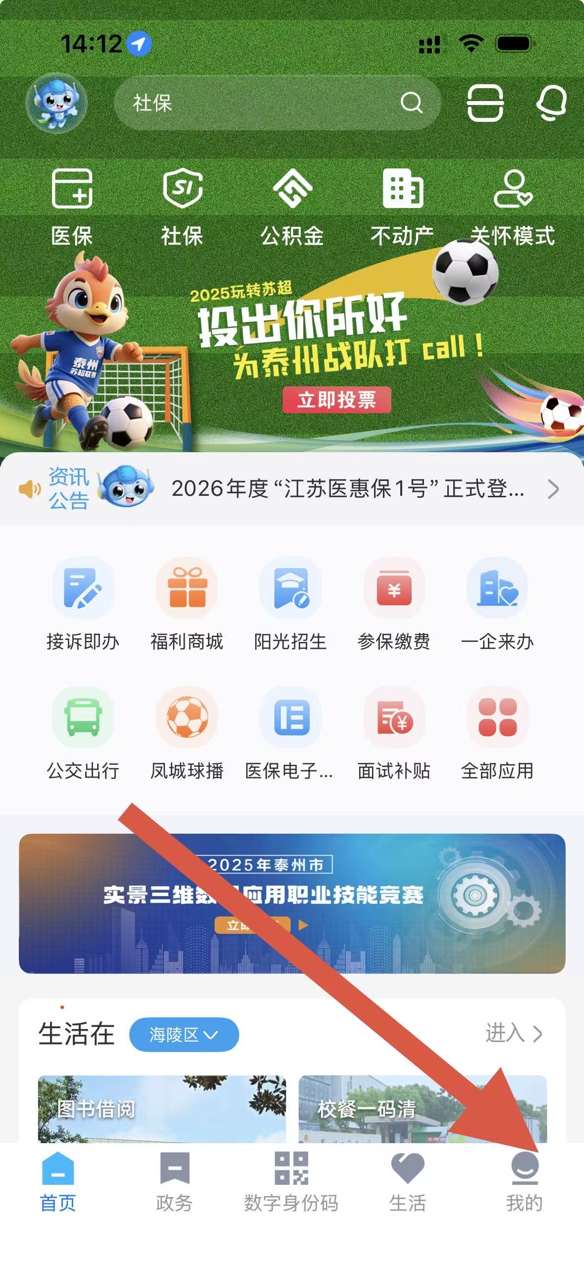 1、打開泰州通app,在首頁點(diǎn)擊底部導(dǎo)航欄中的我的選項(xiàng),進(jìn)入個(gè)人頁面。