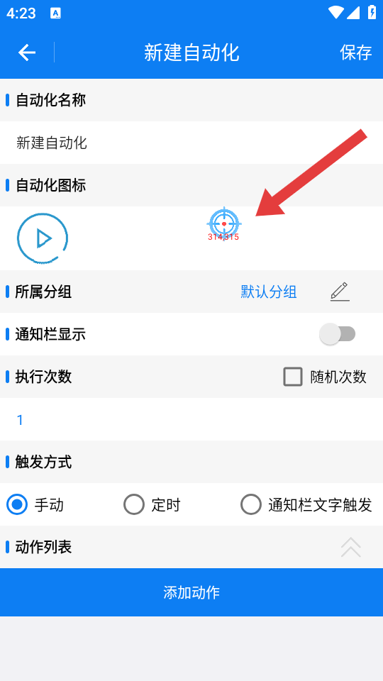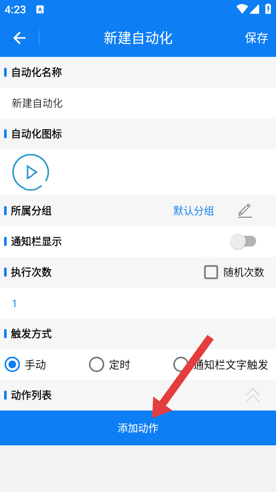 2、在新建自動化頁面,點擊底部添加動作按鈕,進入動作設(shè)置的環(huán)節(jié)。