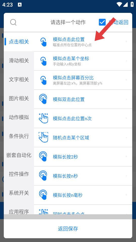 4、在動作選擇列表中,選擇具體的點擊動作,完成動作設(shè)置后,可進一步保存。