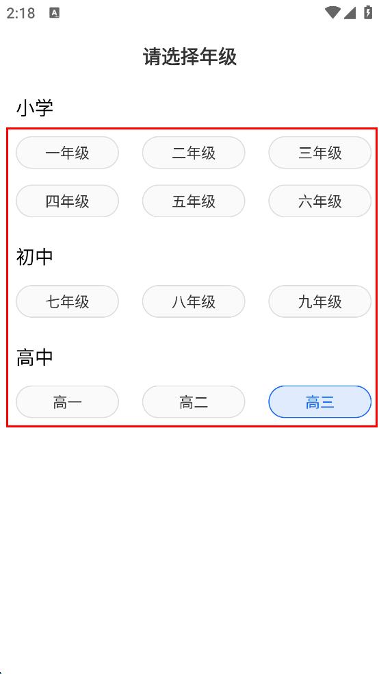 2、進入請選擇年級頁面后,在小學、初中、高中對應的年級選項中,點擊自己所在的年級。