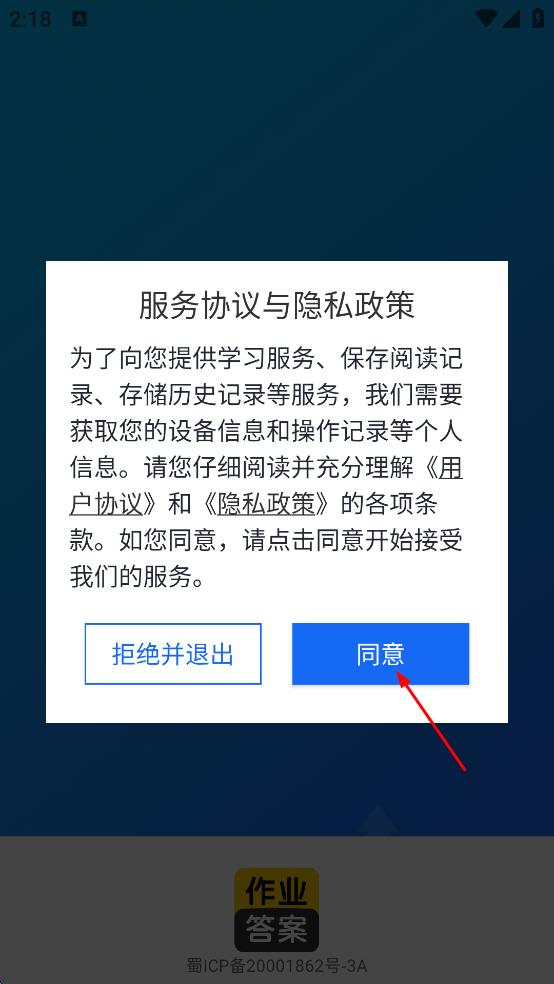 1、打開作業(yè)答案類APP,在彈出的服務協(xié)議與隱私政策提示框中,點擊“同意”按鈕。