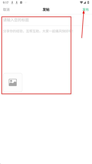 3、在發(fā)帖頁面,輸入標(biāo)題和內(nèi)容,可添加圖片,點擊右上角的發(fā)布,完成發(fā)帖操作。
