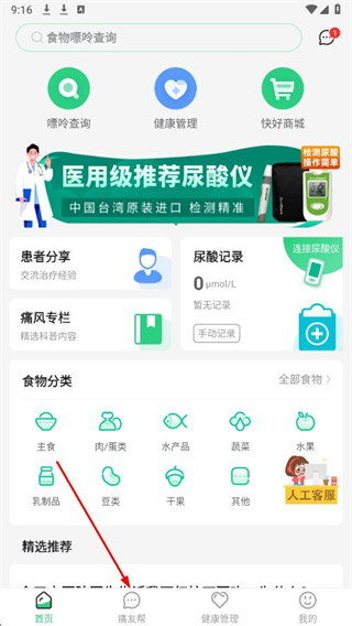1、打開痛風(fēng)快好APP,點擊導(dǎo)航欄中的痛友幫。