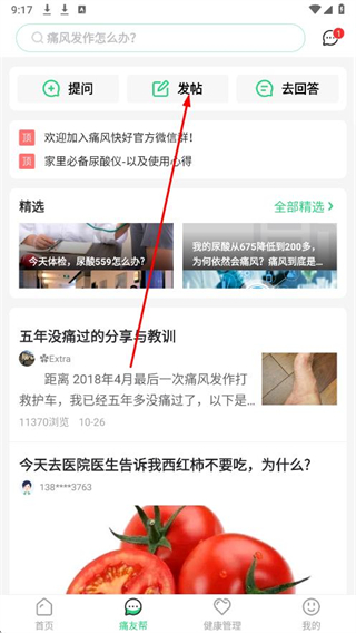2、在痛友幫頁面,點擊發(fā)帖。