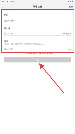 3、在賬號注冊的頁面中,用戶需輸入手機(jī)號并獲取驗(yàn)證碼輸入進(jìn)去,再填寫密碼點(diǎn)擊注冊即可。
