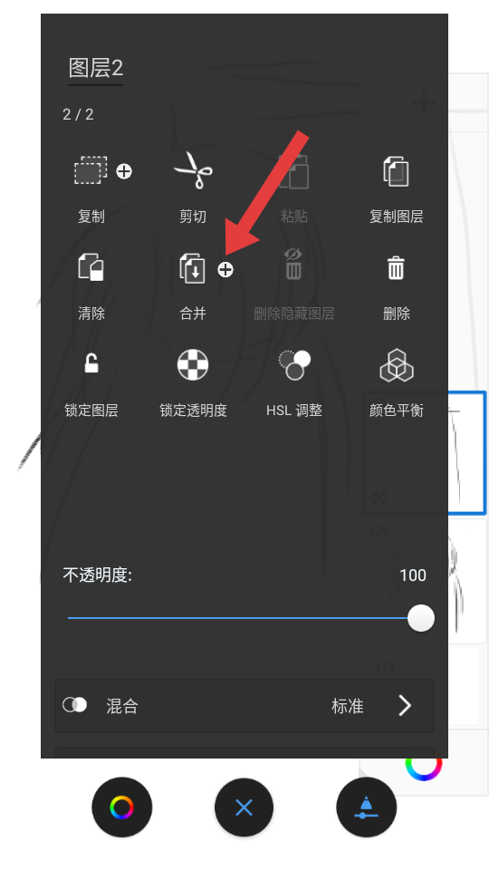 3、在彈出的圖層操作菜單中,點擊合并按鈕,執(zhí)行圖層合并操作。