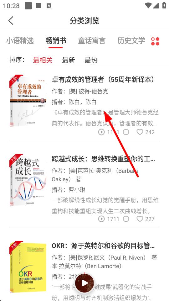 2、在分類瀏覽頁面中,找到想要聽的書籍,比如卓有成效的管理者55周年新譯本,點(diǎn)擊該書籍進(jìn)入詳情頁。