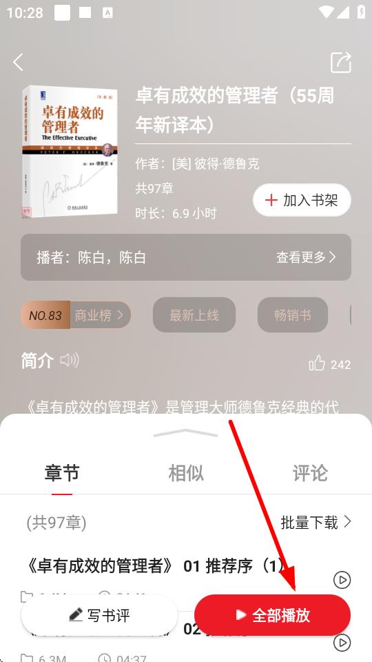 3、在書籍詳情頁中,點(diǎn)擊下方紅色的全部播放按鈕,即可開始播放該書籍內(nèi)容。