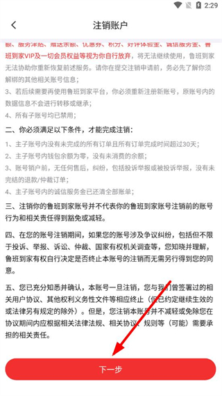 5、在注銷賬戶頁面閱讀相關(guān)須知后,點擊下一步,按照提示完成賬號注銷操作。