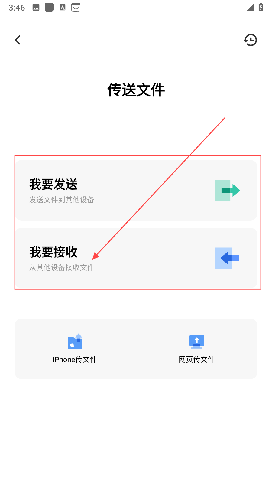 1、打開(kāi)互傳應(yīng)用,在主界面點(diǎn)擊傳送文件板塊進(jìn)入傳送文件頁(yè)面,點(diǎn)擊我要接收選項(xiàng),此時(shí)應(yīng)用開(kāi)始搜索可連接的設(shè)備。