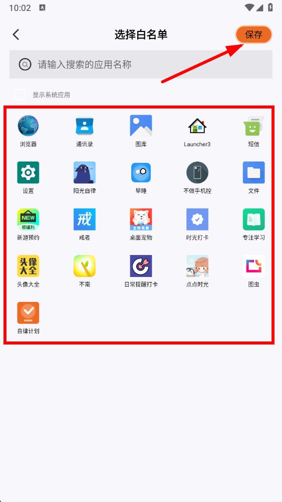 4、在選擇白名單頁(yè)面,根據(jù)個(gè)人需求點(diǎn)擊需要添加到白名單的應(yīng)用,點(diǎn)擊右上角保存,完成白名單設(shè)置。