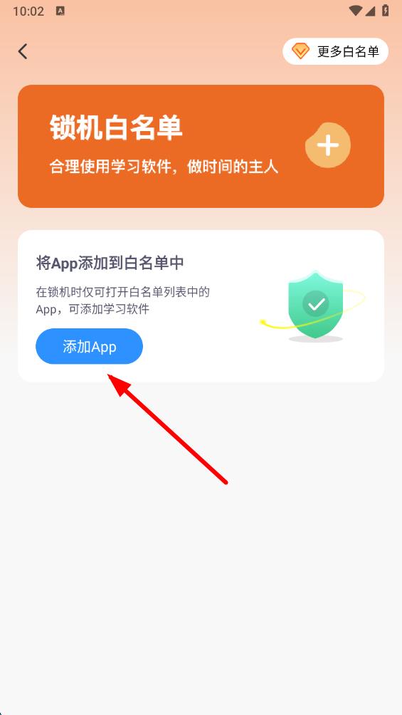 3、進(jìn)入鎖機(jī)白名單界面后,點(diǎn)擊添加App按鈕,進(jìn)入選擇應(yīng)用的頁(yè)面。