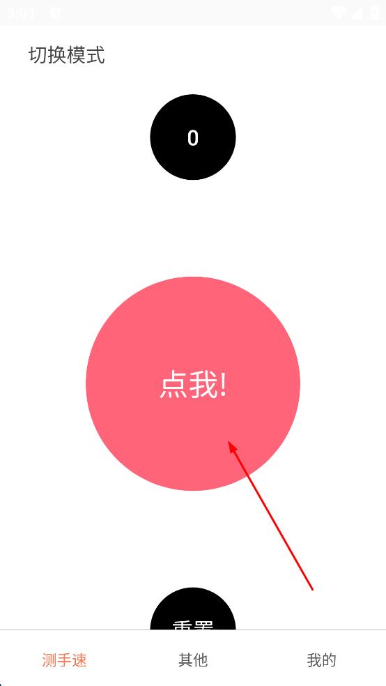 2、在測手速界面,看到中間有個寫著“點我!”的粉色圓形按鈕,此時開始準備點擊該按鈕來測試手速。