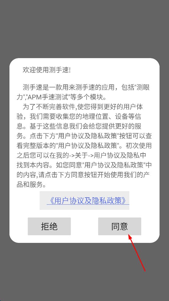 1、打開測手速應用,彈出“歡迎使用測手速!”等內(nèi)容的提示框,仔細閱讀相關說明后,點擊“同意”按鈕,進入應用測手速界面。