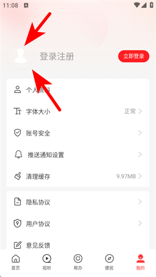 2、在個人的頁面,我們需要點擊登錄注冊,進入登錄選擇界面。