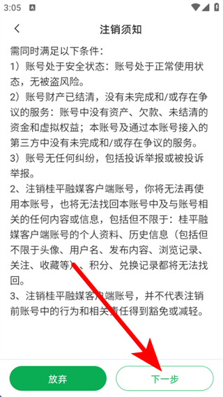 4、在注銷須知的頁(yè)面,點(diǎn)擊下一步,按照提示完成賬號(hào)注銷操作。