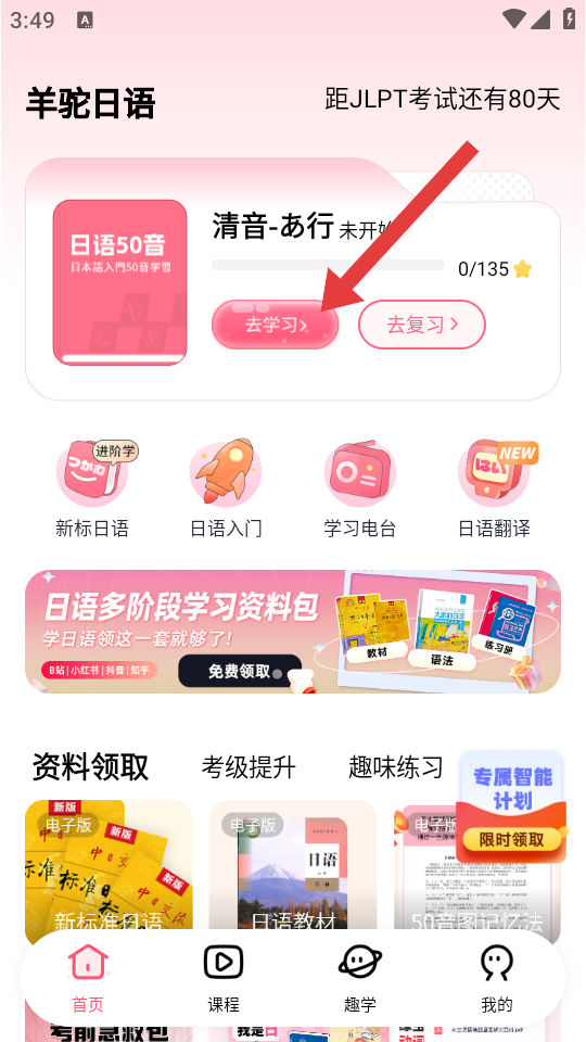 1、進(jìn)入愛上學(xué)日語首頁,點擊日語50音板塊的去學(xué)習(xí),進(jìn)入學(xué)習(xí)頁面。
