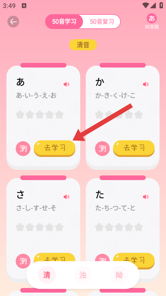 2、在頁面選擇要學(xué)習(xí)的假名行,點擊去學(xué)習(xí),進(jìn)入單個假名的學(xué)習(xí)界面。