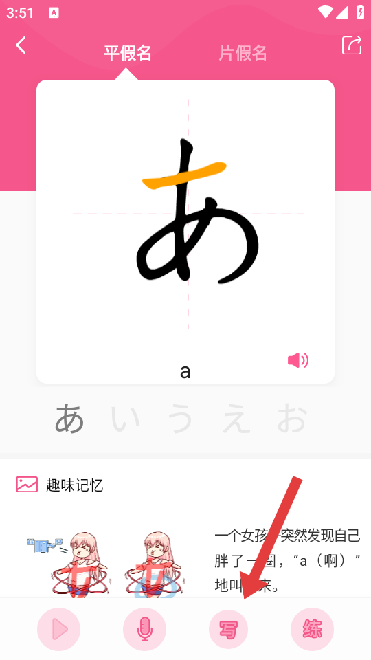 3、在學(xué)習(xí)界面可查看假名的書寫演示等內(nèi)容,可以點擊寫,進(jìn)入書寫練習(xí)界面。