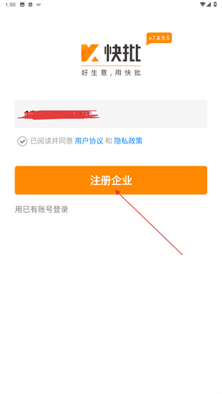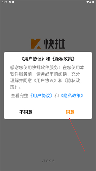 1、打開(kāi)快批APP,進(jìn)入時(shí)會(huì)彈出用戶協(xié)議和隱私政策,點(diǎn)擊同意的按鈕。