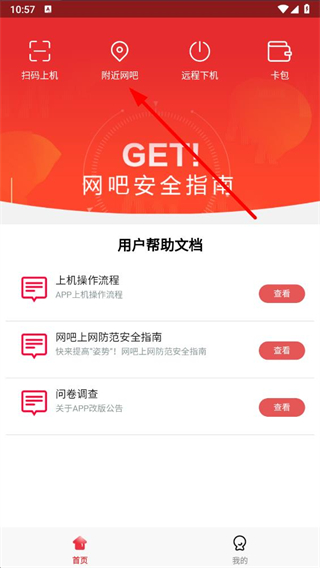 2、首頁有掃碼上機(jī)、附近網(wǎng)吧、遠(yuǎn)程下機(jī)功能,直接使用易上網(wǎng)APP掃描網(wǎng)吧電腦上的二維碼,就能快速上機(jī)。