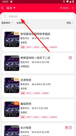 2、在附近網(wǎng)吧列表頁面的搜索欄輸入網(wǎng)吧名稱,進(jìn)行搜索。