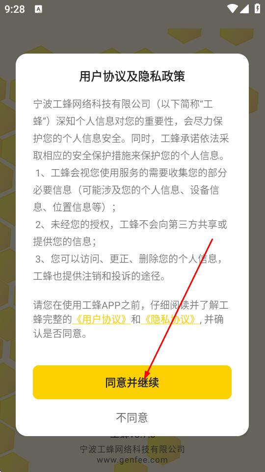 1、打開工蜂APP,在彈出的用戶協(xié)議及隱私政策頁面,點擊同意并繼續(xù)。
