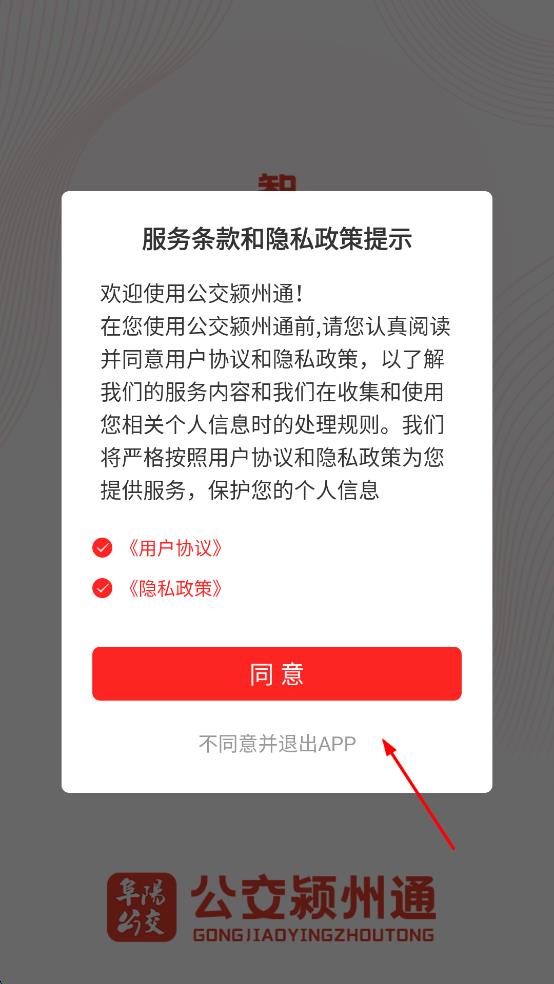 1、打開公交潁州通APP,在服務(wù)條款和隱私政策提示界面,確認(rèn)《用戶協(xié)議》和《隱私政策》已勾選,點(diǎn)擊同意,進(jìn)入APP主界面。