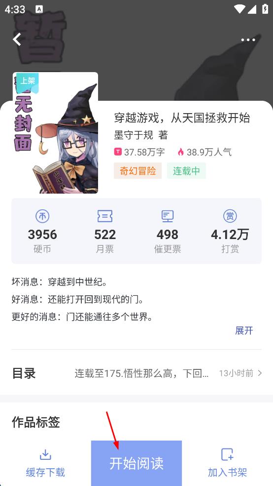 3、在小說詳情頁面,找到“開始閱讀”按鈕并點(diǎn)擊,進(jìn)入小說閱讀界面。