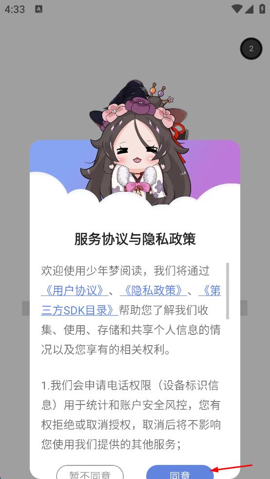 1、打開少年夢閱讀APP,彈出服務(wù)協(xié)議與隱私政策窗口,閱讀后點(diǎn)擊“同意”按鈕,進(jìn)入APP主界面。