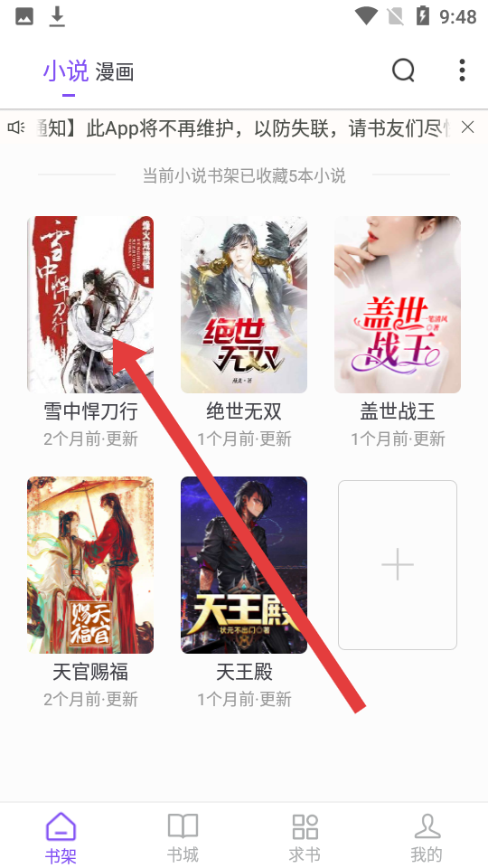 1、在天空閱讀書架頁,找到想緩存小說,如雪中悍刀行,點(diǎn)擊進(jìn)入閱讀界面。