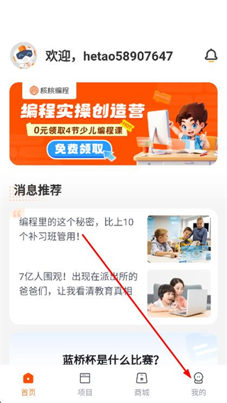 1、打開核桃編程app,點擊底部導(dǎo)航欄中的我的選項。