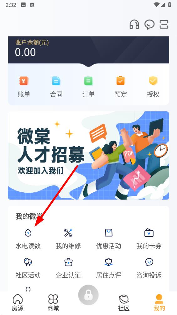 2、在進(jìn)入的界面中,找到水電讀數(shù)選項并點擊,進(jìn)入抄表記錄查看頁面。