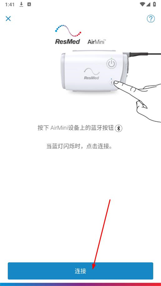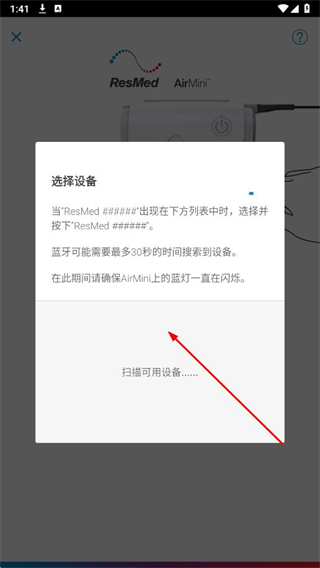 3、在選擇設(shè)備頁面,等待掃描可用設(shè)備,出現(xiàn)ResMed時,選擇并按下,完成連接。